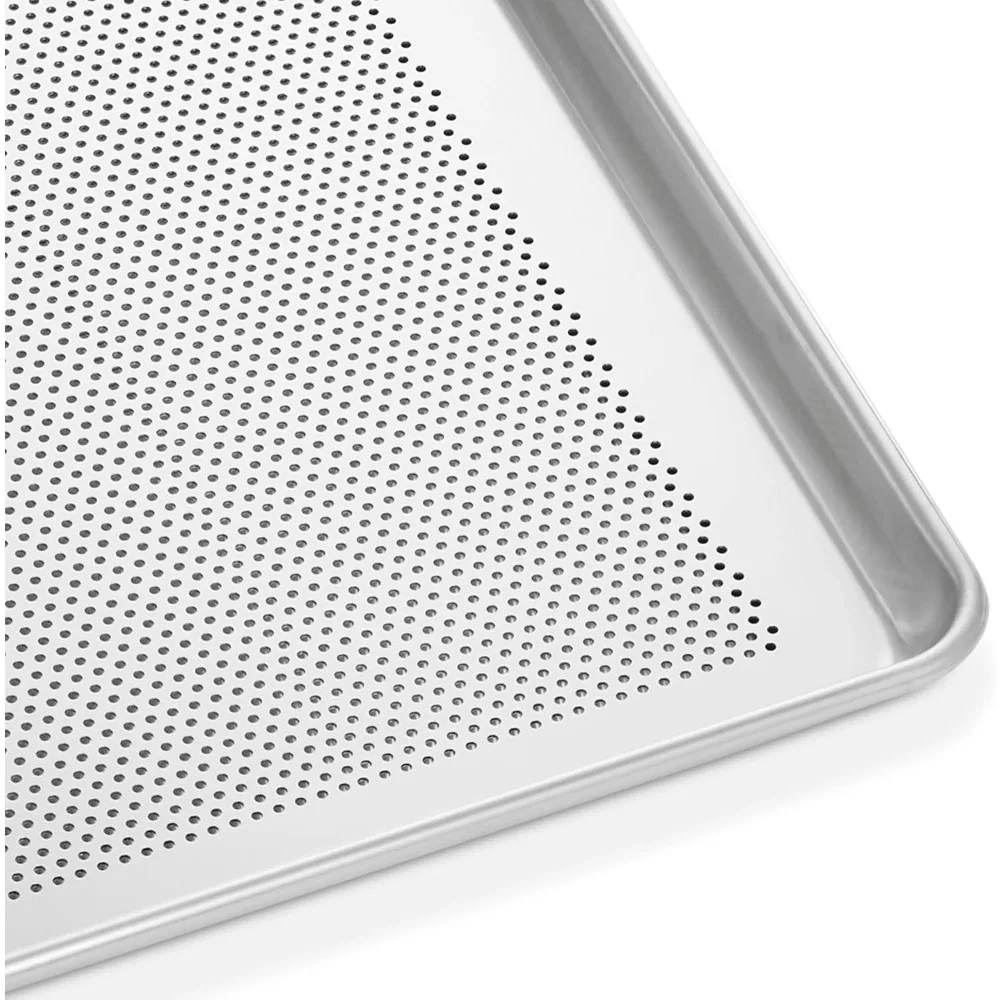 - Heavy-duty aluminum construction: These 13” x 18” perforated sheet pans feature a closed bead design with a wire-reinforced rim, enhancing their durability and structural integrity. Made from commercial-grade, 3003 aluminum, these pans resist warping and maintain their shape under high heat and frequent use.